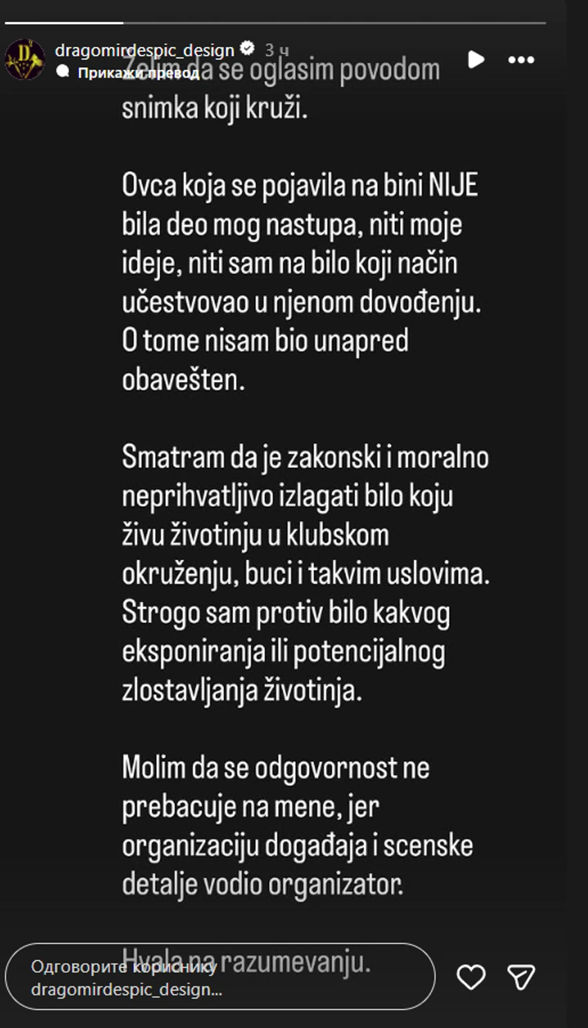 – Želim da se oglasim povodom snimka koji kruži. Ovca koja se pojavila na bini nije bila deo mog nastupa, niti moje ideje, niti sam na bilo koji način učestvovao u njenom dovođenju. O tome nisam bio unapred obavešten. Smatram da je zakonski i moralno neprihvatljivo izlagati bilo koju životinju klupskom okruženju, buci i takvim uslovima. Strogo sam protiv bilo kakvog eksponiranja ili potencijalnog zlostavljanja životinja. Molim da se odgovornost ne prebacuje na mene, jer je organizaciju događaja i scenske detalje vodio organizator. Hvala na razumevanju– naveo je u saopštenju.